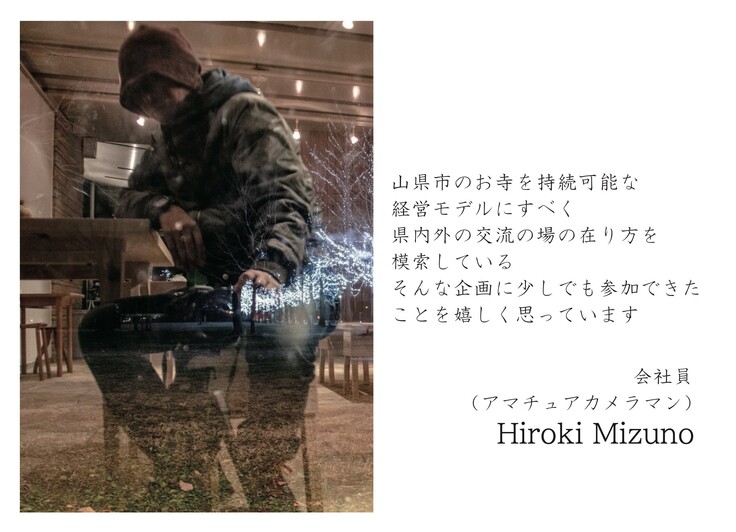 水野さまも間違いなく「人の行き交う東光寺」になるためにターニングポイントになりました。①でご紹介した春木様と知り合うことになったのは水野様が著名なカメラマンの方々へ紹介してくださったことがきっかけでした。そのためライトアップ「夜の東光寺」で知られる前から凄腕カメラマンの方々に周知されておりました。いつもInstagramを拝見するとかっこいいギャラリーですが、実際お話しするととても物腰柔らかな方です。応援コメントも無理を言いお願いしたのですが、熱い想いのこもったメッセージをいただき、大変うれしく思います。
