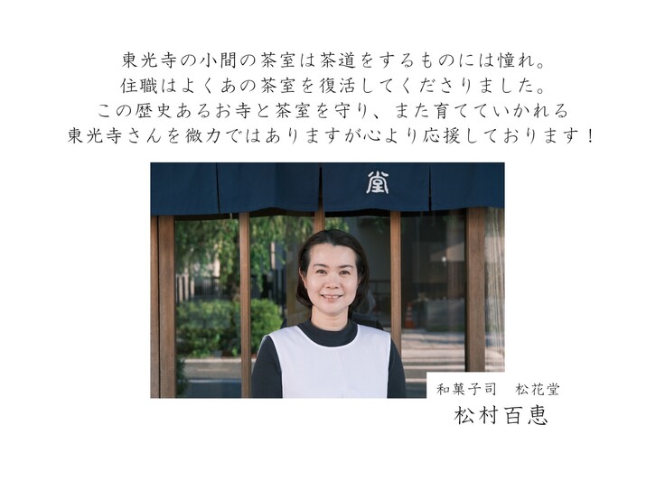 いつも東光寺では和菓子作りでお世話になっております。同時に今回の応援コメントでは百恵様自身が長年茶道の稽古を積まれており、百恵様ならでは視点で応援メッセージをいただきました。寺嫁自身も「お茶を習えば百恵さんのようなおしとやかな女性になるのかな」と動機でお茶を習い、このプロジェクトに月見茶会でお点前を振舞うことになります。そんな松花堂は100年以上の歴史がある和菓子司で、「岐阜と言えば松花堂」と移住して真っ先に岐阜の方に教えていただいた松花堂様の和菓子はすごく美味しいですし、去年の月見茶会でも和菓子を提供いただき、和菓子になじみがない若い世代にも大好評でした。私個人的には特に栗きんとんとわらび餅が好きです。
