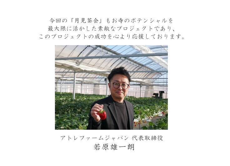 「小学生のころから檀家である友達がよくお寺に遊びに行くのによくついて行っていたことがきっかけで子ども時代からお寺になじみがあった」と仰っていました。そういう経験からなんでしょう。私が東光寺として一緒にワークショップのコラボ企画を持ち込むと「山県市を盛り上げる」ということで快くご了承いただきました。若原様が代表取締役を務める「体験農園みとか」ですが地産地消を掲げ、岐阜の方だけでなく、インバウンドのお客様もいちご狩りに沢山の方が来園されますが「みとかに来てくれても、山県市に周遊してくれる方が少ないことが課題です」と常に山県市を盛り上げる事を主軸に考えてくださっております。今回かなりお忙しい中、想いのこもった応援メッセージを作っていただきました。