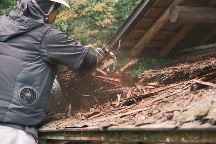 今日から月見茶会で使う茶室の檜皮葺屋根が傷みがひどく、「一刻も早く修繕しないとこのままでは屋根が腐ってしまいます!」と職人さんに驚かれてしまい、この月見茶会を機に間に合うように葺き替えすることになりました。職人さんからはよくこの状態で雨漏りしなかったことが不思議だったようです。天然素材の屋根は雨漏りすると深刻な問題なんです…‼(お金も労力も…)これはお寺に関わる仕事をしないと分かりませんでした。日本には檜皮葺屋根や茅葺屋根、杮葺き屋根などいろんな種類の屋根があります。ただの茶色の屋根ではなく奥深い日本の伝統技術が集結している日本が海外へアピールできる「刀」のような存在だと思っております。今後お寺の見方を確実に変えて、こういったこと職人さんのことや伝統建築のことも含めて発信していけるように、今山県市に掛け合っております。今回の写真は葺き師の方が傷んだ檜皮葺屋根を剝いでいる様子です。こういった発信のこともご理解いただいており、今回特別に撮影させていただきました。この投稿をご覧いただいた皆さまもぜひこういった伝統建築を見た時、「これが日本のプライドだ」と思っていろんな方に発信していただけると職人さんや我々お寺をお守りしている身としては嬉しいです。