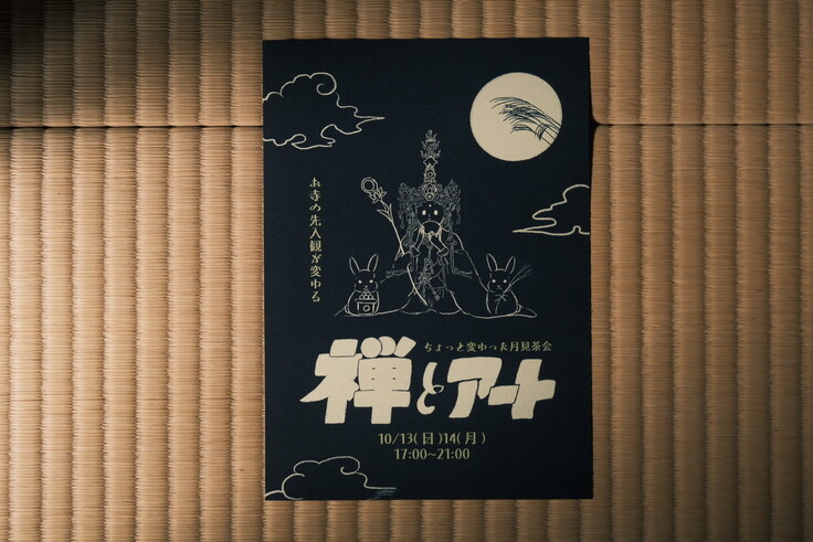 じつは月の光で煩悩を消す月光菩薩(ぼさつ)様なんです!投稿者自身、月を見て一瞬だけ煩悩が消えたことがあるので「なんて現実的な菩薩様なんだ!」と感銘を受け、推しの菩薩様になりました。「禅とアート」では17時から月光菩薩様に対して法要をします。そしてなんといってもこのゴージャスな冠はどうしてもフライヤーで表現したいということで、夜更かししながら描きました。でも本当は舘鼻様の作品を全面に押し出すつもりだったので果たして自分のイラストで良かったのか不安でしたが、仏像に興味ない方にも「かわいい!」「フライヤー天才すぎる」とコメントいただき、朝の4時まで頑張って良かったです。もしどこかで見つけた時にはぜひ手に取って見てみてください。投稿者のアカウントはこちら