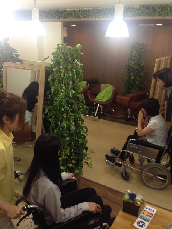 写真は、店外内での車椅子の介助と、車椅子カットの様子です。