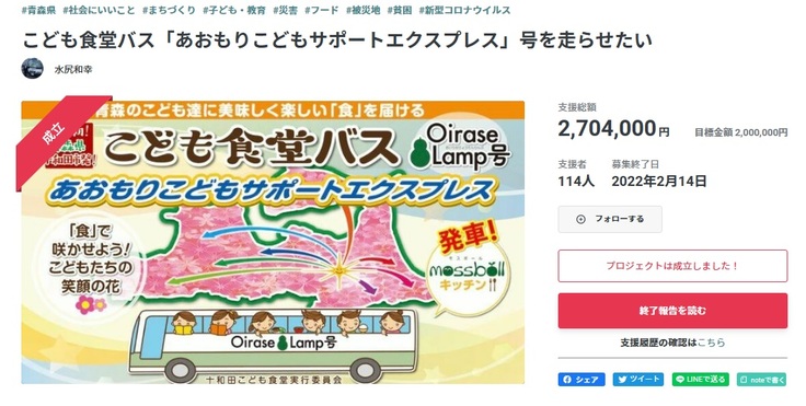 中古バスをキッチンと客席を備えた食堂車に改造し、十和田市だけではなく、青森県内各地へ出向くことができる「こども食堂バス」を用意すべく、2019年の12月にクラウドファンディングに挑戦しました。