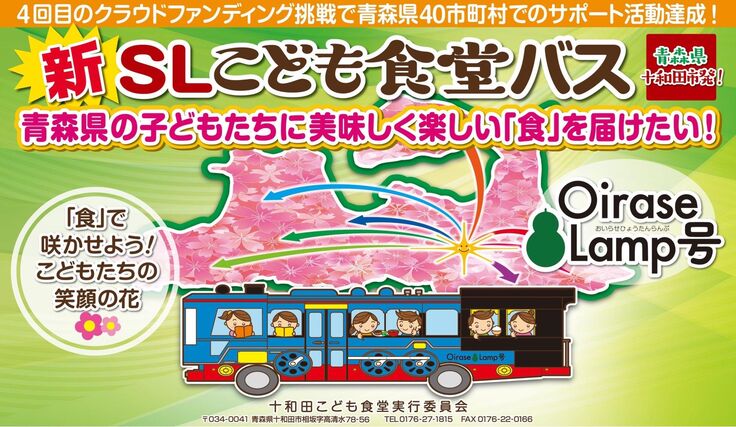 新SLこども食堂バス「奥入瀬ひょうたんランプ号」が青森県十和田市から、美味しく楽しい「食」と、あたたかい「こころ」を乗せ、みんなのところへ早く、そしてたくさんお届けします!