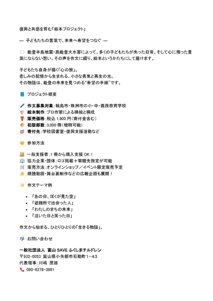 以前の「ふるさとはフクシマ子どもたちの3.11」の編集事業に携わっていたこそ、今回の「能登半島地震+奥能登大水害」の「絵本プロジェクト」が更に大きくなりました。