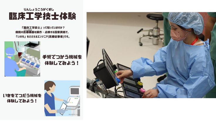 こちらは臨床工学技士の体験です:心臓血管外科の体外循環の装置。わたしも触ったことがないのですが、小学生が操作してます。ただ触っているのではなく、臨床工学技士の方が操作法をきちんと指導され、その通りにみな操作してくれていました。すごい!