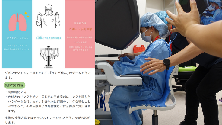 体験してもらった内容は、手術室看護師(器械出し・外回り)、麻酔科(気管内挿管)、CE(人工心肺を操作)、消化器外科(内視鏡手術、電気メスで鶏肉を切開)、呼吸器外科(手術ロボットダヴィンチのシミュレーターの操作)、眼科(白内障手術)、乳腺外科・形成外科(乳がんの触診・皮膚縫合、糸結び、シリコンインプラントを用いた乳房再建)と、実臨床に則したかなり本格的な内容でした。ちびっこも大よろこびでした!