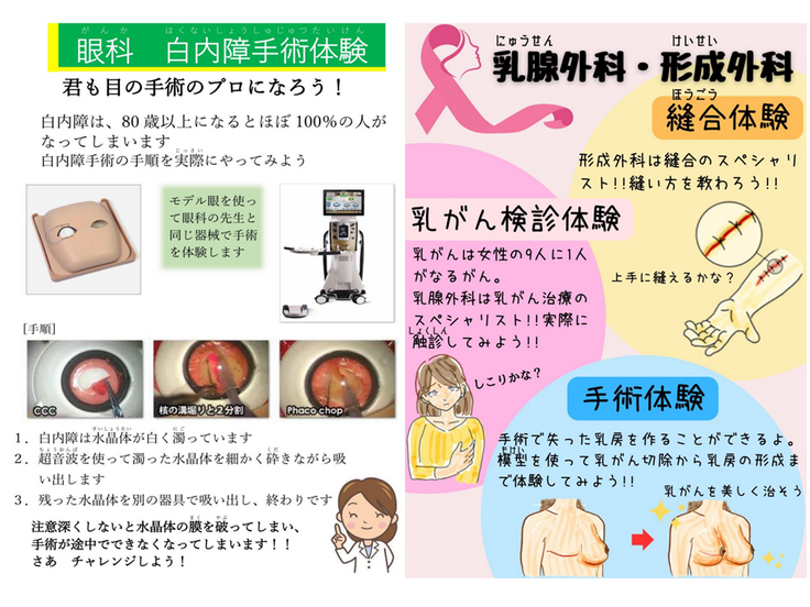来年度以降は、心臓血管外科、脳神経外科、整形外科、産婦人科、耳鼻咽喉科、泌尿器科、歯科口腔外科、消化器内科(内視鏡治療)などの診療科にも参加してもらい、子どもたちが経験できる手技を広げていきたいと考えています。
