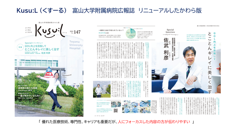 富山大学附属病院の広報誌(かわら版)が今年度からリニューアルしました。Kusu:L(くすーる)というユニークなネーミングです。読む「くすり」、よ「くする」、「くすっ」と笑う・・・をイメージしています。2024年5月発刊で、配布&郵送などで1000部が、あっという間になくなりました! このかわら版は、附属病院ではたらく人にフォーカスした編集ポリシーとなっており、写真も美しい(変わったものでもOK)。その人となりがわかるコンテンツになっています。こちらをご覧ください。