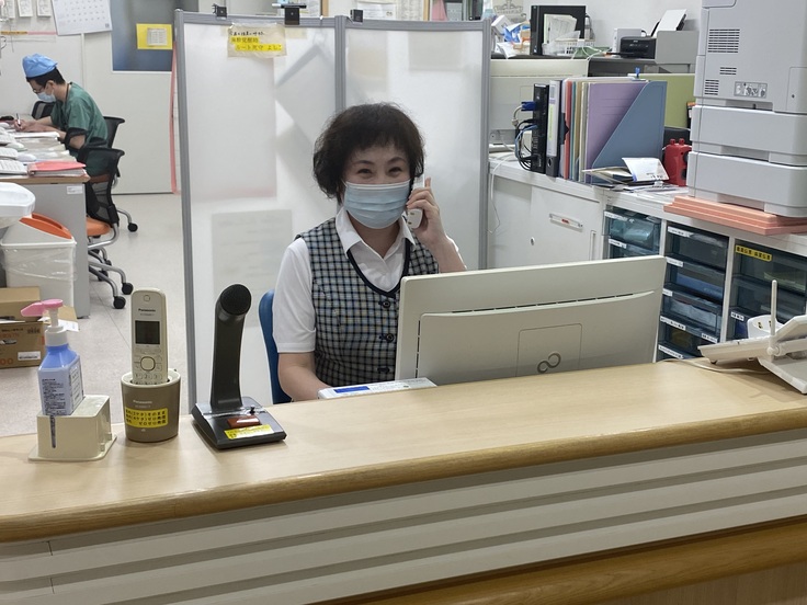 富山大学附属病院手術室で働く様々な医療スタッフをみなさんにご紹介させていただきます。富山大学附属病院手術室のエントランスから中に入ると、右手が受付になります。そこには、受付の中村さんが居ます。いつも明るく朗らかでニコニコ(^^♪され、とても感じのよい受付さんです!患者さんが入室される際には、麻酔科医や医療スタッフにとても美しい声でアナウンスしてくれます。「3番、申し送りお願いします!」 また患者さんが入室される時間が変更となる場合は、医師の院内モバイルに直接連絡をくれますが、とても優しい感じでゆっくりと話してくれるので、とても落ち着きます。いつもありがとうございます! 手術をお受けになる患者さんも安心して、手術室にお越しください。