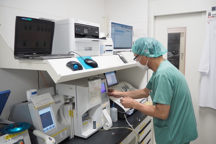 富山大学附属病院では手術室に臨床検査技師さんが常駐しています。手術中の患者さんの血液検査で、血液ガス分析・血算・マグネシウム・タンパク質などの測定 を行っています。手術中の患者さんは、疾患や手術の内容、人工心肺などの影響で通常とは異なる検査値を認める場合があります。手術室の臨床検査技師さんは、それらの影響を考慮した上で検査値が正常か異常かを判断し、異常を認めた場合には速やかに麻酔科医に連絡します 。