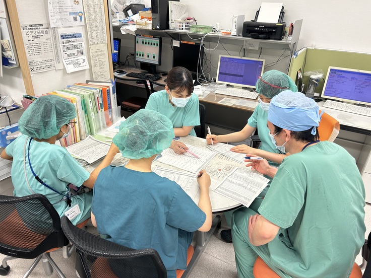 富山大学附属病院手術室で働く様々な医療スタッフをみなさんにご紹介させていただきます。以前にこの活動報告で、外回り看護師さん・間接介助(2024/08/15)と器械出し看護師・直接介助(2024/08/10)についてお話させていただきました。今日は手術室のトップマネジメントに深くかかわる看護師長さん・副看護師長さんです。手術室看護師をはじめ、さまざまな医療スタッフと連携して、手術が滞ることなく安全に終えられるよう、さまざまな調整を行ってくれています。写真は木曜日のお昼12時です。12時からの遅出出勤した看護師3名(写真手前3名)に対して、秋本副看護師長と日勤の看護師(写真奥2名)から、申し送りを行っているところです。その日の各手術室の進捗状況を伝えています。具体的な内容は、看護スタッフのお昼交代や休憩、終了した手術室の後片付け、次の手術に向けた準備と采配などについてです。出発前のブリーフィングですね!