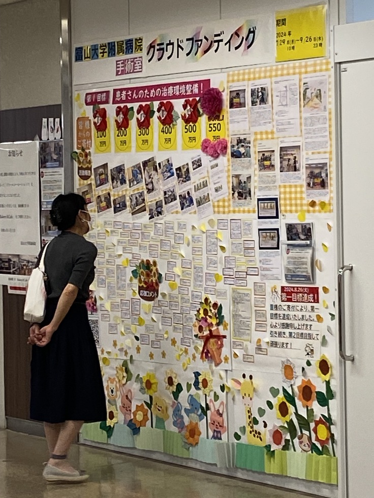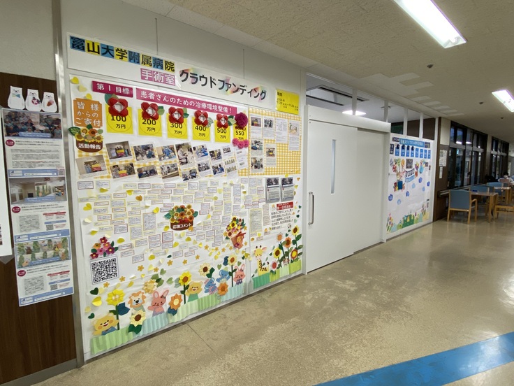 みなさん、こんにちは!富山大学附属病院1階エントランス後方で、入院支援センター横の通路の壁を見ていただけてますでしょうか。ここに手術室クラウドファンディングの特設パネルを設置したことを、2024/08/22の活動報告でお伝えさせていただきました。黄色&赤色を基調としたパネルですが、この写真のむかって右側後方に青色を基調とした新しいパネルが....。