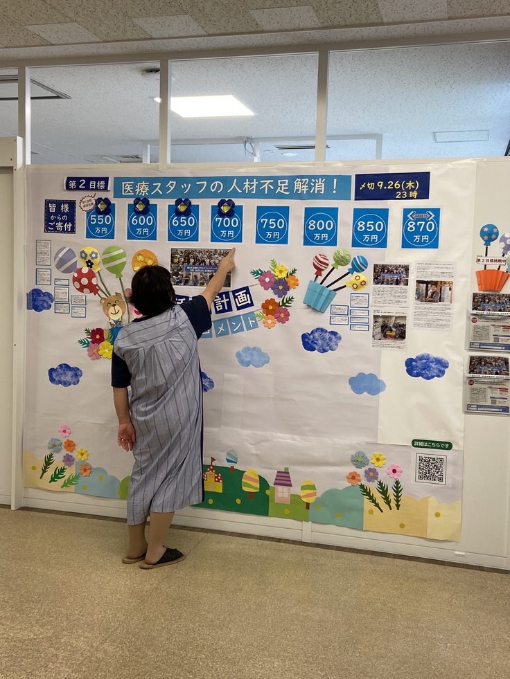 そして、じゃじゃーん。今回、ブルーを基調とした特設大パネルを新たに設置しました。こちらにはNEXT GOAL(第二目標)のプロジェクト以降の活動報告と応援メッセージを順に掲載して参ります!富山大学附属病院にお越しいただきましたら、是非とも足をとめてご覧ください。「順調に進んでいますね!」٩(๑❛ᴗ❛๑)۶ !