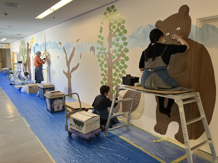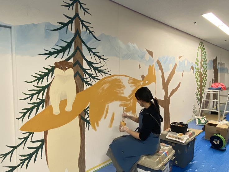 こんばんは! プロジェクトリーダーの佐武利彦です。画家の細井茶生さん、ご自身の所属されている美大から戻られ、早速、急ピッチで4名のスタッフさんと完成を目指しています。脚立に座り、足をぶらぶらさせながら、楽しそうに富山の大自然を背景に、いくつもの動物を次々と描いていきます。