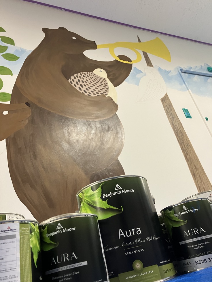 ベンジャミンムーアペイントのオーラという塗装材料だそうです。 夜の22時をまわり、手術室前に行ってみましたが、すでに消灯されていました。細井茶生さん、スタッフのみなさん、お疲れさまでした! 今日も、富山大学手術室のために、アートを描いていただき、ありがとうございました!