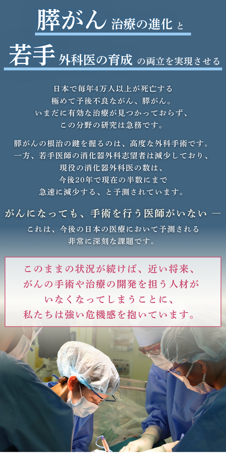 私たちは、「膵がん治療の開発」と「消化器外科医の育成」、これらの大きな問題に真正面から取り組んでいます。