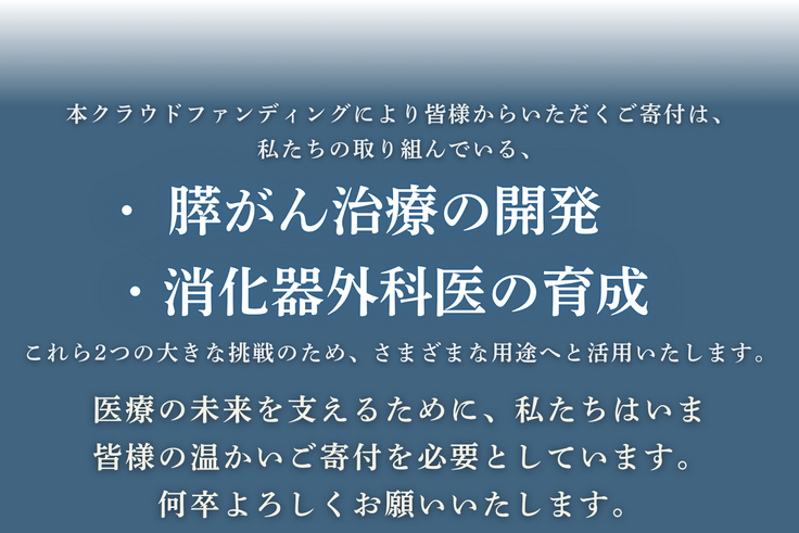 私たちが取り組んでいる「膵がん治療の開発」と「消化器外科医の育成」、医療の未来を支えるこれら2つの挑戦に、ぜひ温かいご寄付をお願い申し上げます。
