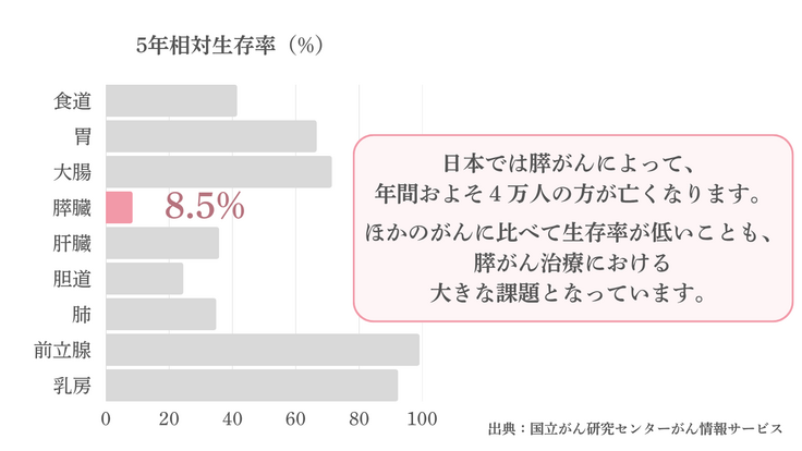 膵がんは、日本で毎年4万人以上が死亡する極めて予後不良ながんです(※1)。早期発見が困難であり、根治の鍵を握るのは高度な外科手術です。しかし、いまだに有効な治療はなく、「治療開発のための臨床研究」が不可欠です。