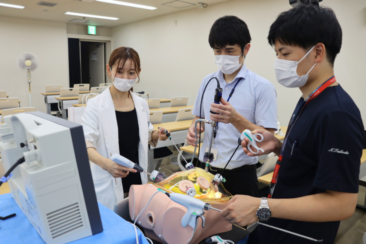 ⼿術のトレーニングを実際の患者さんで⾏うことはできないため、⼿術器具、シミュレーターで練習できる環境を整備する必要があります。特に腹腔鏡⼿術は練習が必要であり、学⽣時代から練習を重ねることで、技術レベルの⾼い若⼿外科医が育成できます。