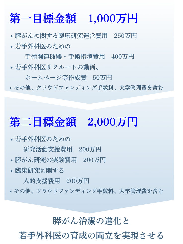 第二目標(2,000万円)に向けていただくご寄付は、引き続き、膵がん治療の進化と若手外科医の育成の両立に向けて、おもに若手外科医のための研究活動支援費用・膵がん研究の実験費用・臨床研究に関する人的支援費用等に活用いたします。