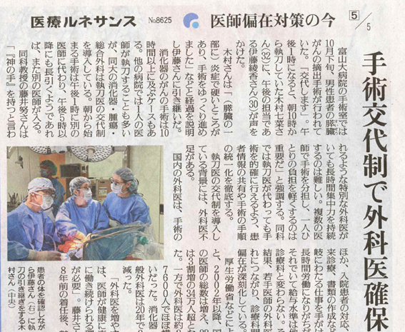 11/12付の読売新聞「医療ルネサンス」欄にて、当教室が取り組む手術交代制の試みを紹介いただきました。