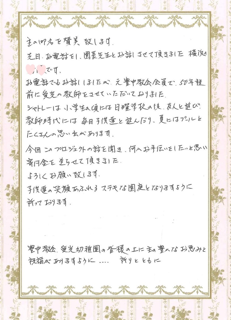 多くの方から園の昔のお話を聞かせていただいたり、これからを楽しみにしてくださっているあたたかい気持ちをプレゼントしていただいています。みなさまの愛に心から感謝申し上げます。