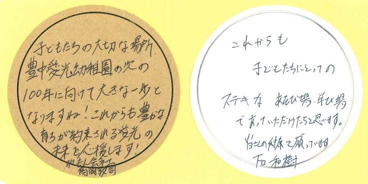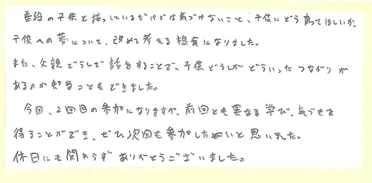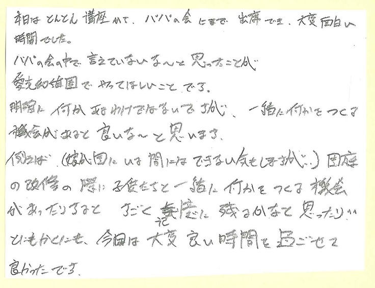 「おこさんにどう育ってほしい?」という話や「園にやってほしいことある」ということなども話しました。パパ感想2にある、園庭創りの時に、こどもたちと一緒に何か作る機会あったらな~と言ってくださってうれしいです。今回の園庭創りでは、みなさんと一緒に!という思いがあります。例えばそのひとつとして、植樹をする時に親子で参加してもらえたらなぁ~など、考えています。ぜひ、協力してください。