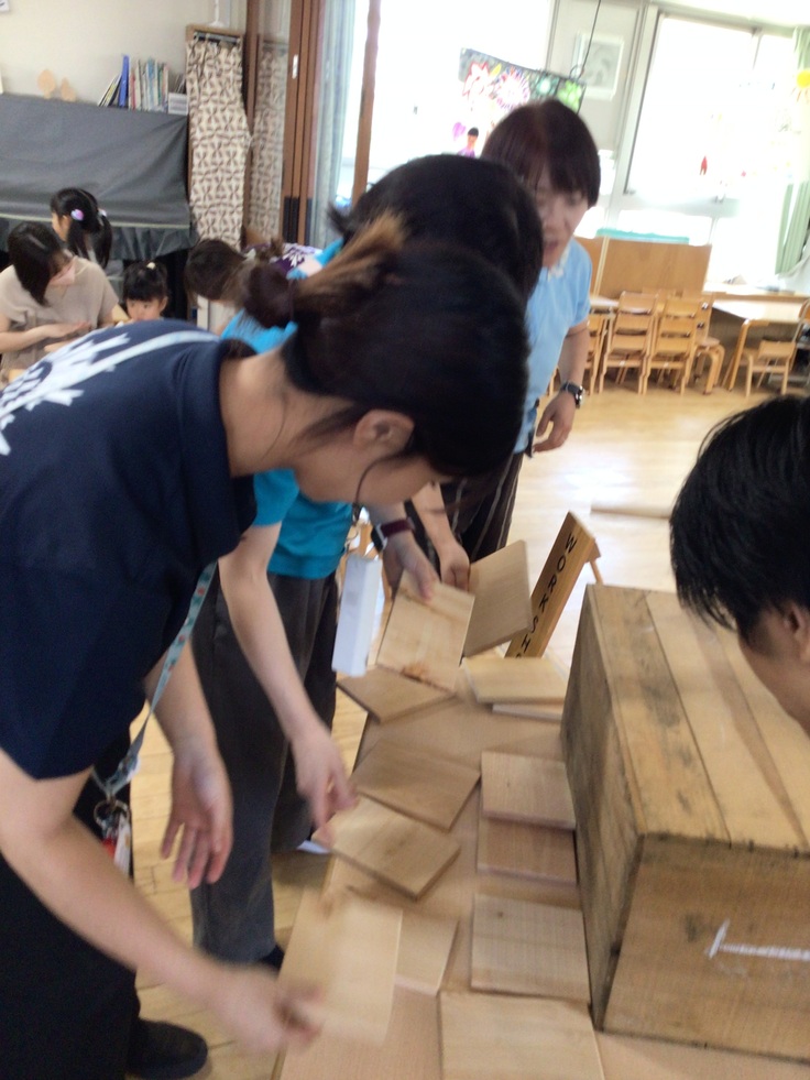 いい香り~と言いながら、先生たちも木を選んで作りました。)