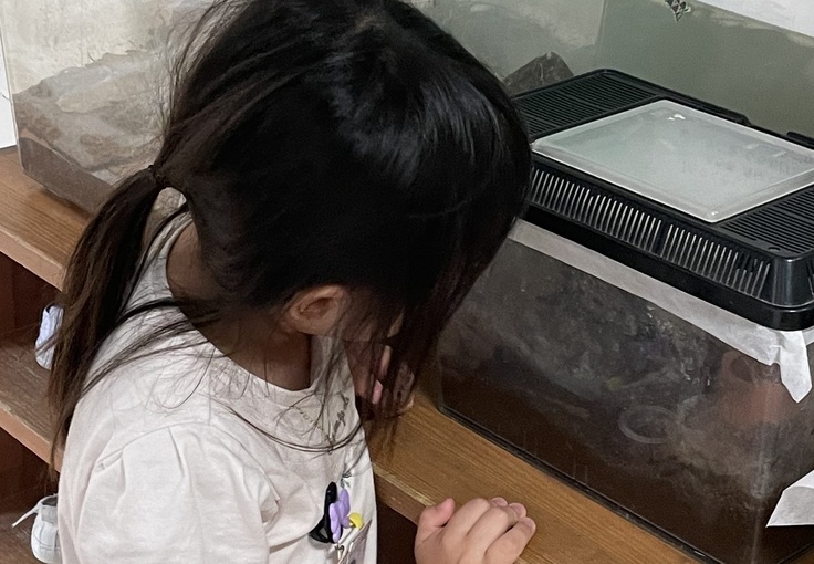 最近のこどもたちの関心は廊下にいるカブトムシとクワガタムシに向いています。こどもたちの生き物を見る力強い眼差しは、目の前の生命をまっすぐに見つめています。