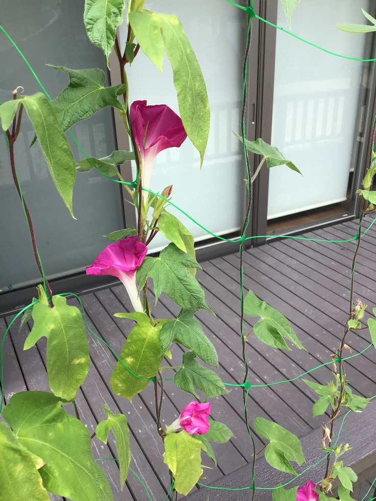 (乳児チームのお部屋前のウッドデッキのところで育てていた朝顔は、次々と花を咲かせています。