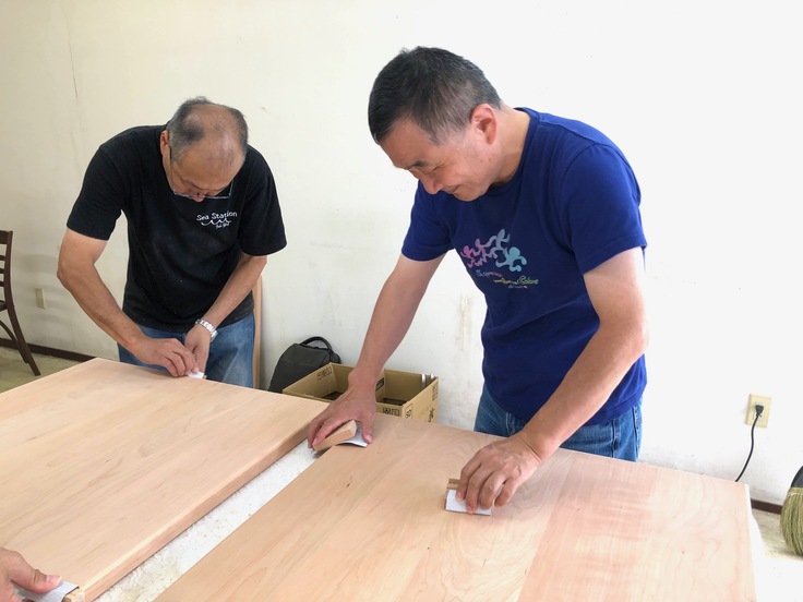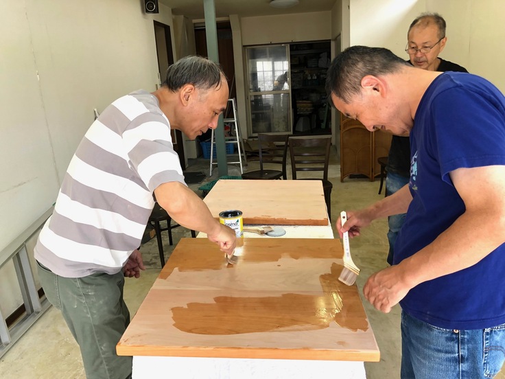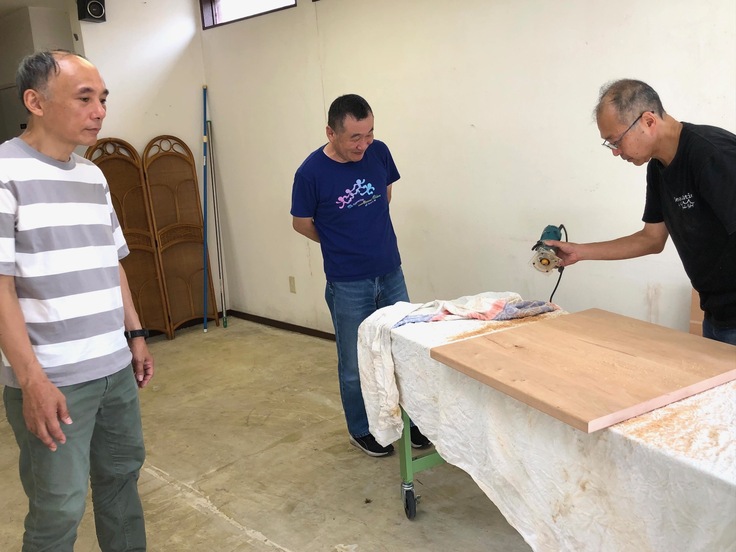 「花はな木工教室」の花山さんを講師にお招きし、まずは、みんなで天板のやすりかけをしました。