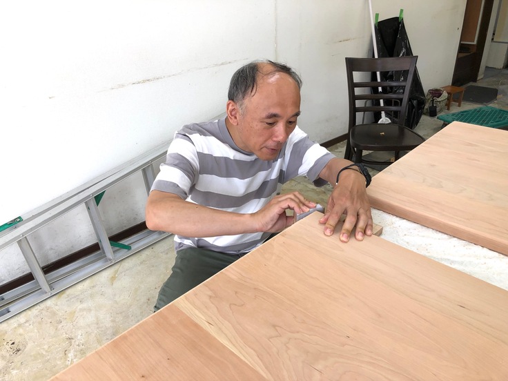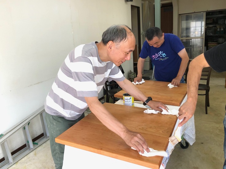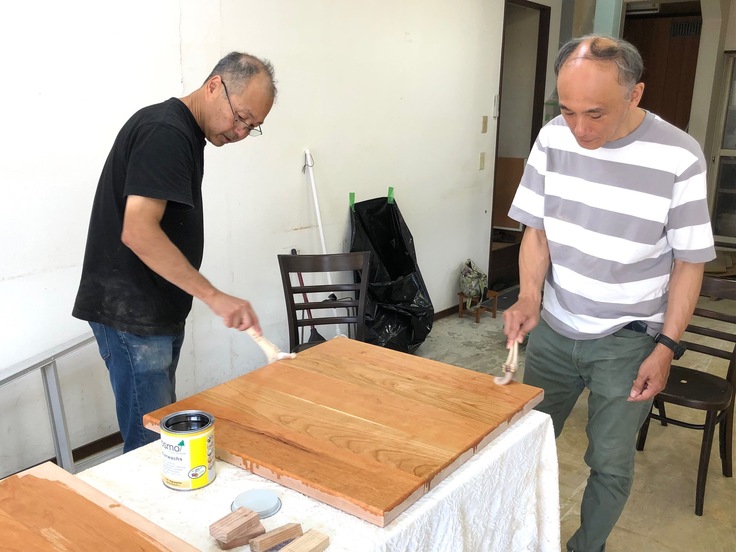 その前に、店舗側の改装前スペースを利用して、テーブルの天板製作のワークショップをしました。