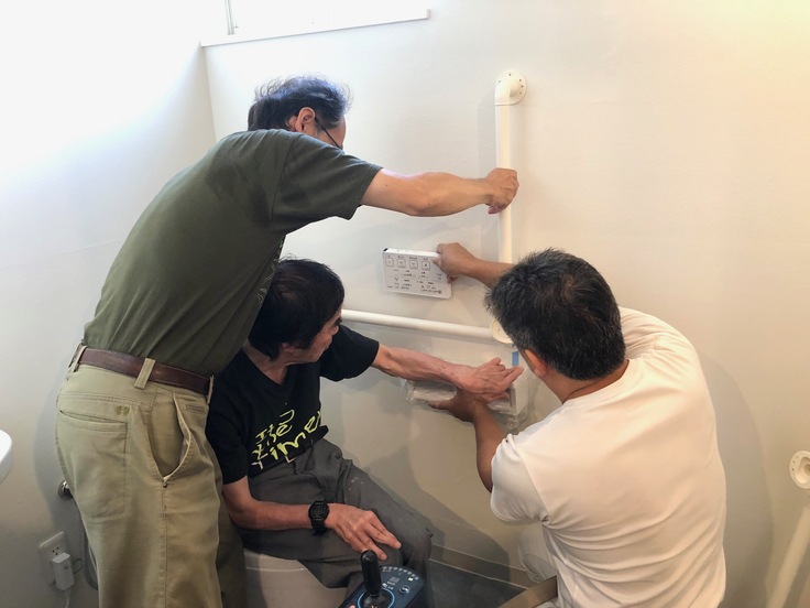 今日は、トイレの中に、手すりをつけるため、車椅子を利用する倉さんに来てもらい、