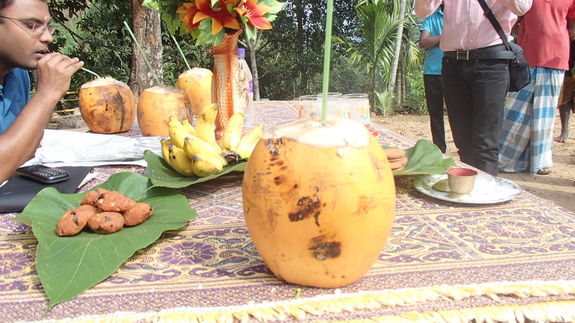 採れたてココナッツジュース。お日様をたっぷり浴びているのでぬるく、さらさらとした液体がたくさん入っています。味は、ほのかに甘いくらいで、しつこくなく、ぐいぐい飲めます。最後の一滴までおいしくいただきました。ちなみに本当かどうかはわかりませんが、このココナッツジュース、二日酔いを防ぐという噂も聞きました。日本でいうしじみ汁のようなものなのでしょうか…