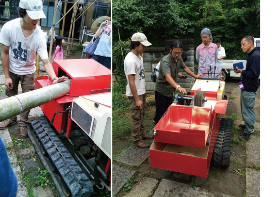 それを受けて早速参加者からは、「制作効率を高める必要性あり」「その為には竹の抑え部分の工夫が必要」「刃の全面使いへ」等の改善個所の指摘があったり、また「刃の大量購入」や「ハーベスタ部分の購入後の輸送コスト削減」コストダウンの工夫等の参考情報が寄せられたり、「発動機としてのオプション利用(第4の用途)はどうか」等など我々だけでは思いつかないような機械の有効利用にむけたアイデアが出されたりしました。
