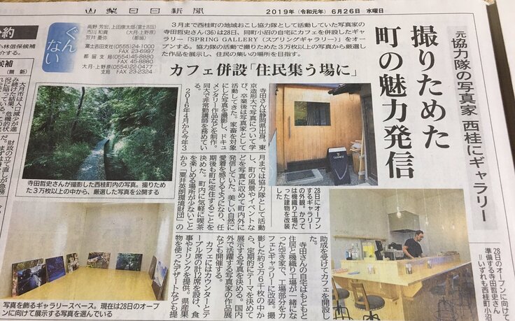 はじめまして。西桂町にあるカフェギャラリー、SPRING GALLERY代表/写真家の寺田哲史と申します。静岡県静岡市生まれの39歳です。高校卒業後、飲食店勤務などの社会人経験をした後、写真家になろうと東京造形大学デザイン学科写真専攻に入学しました。卒業後2016年に同大学非常勤講師になると同時に、地域おこし協力隊として神奈川県から西桂町に移住して地域の活動を開始しました。協力隊活動終了後の2019年6月末に西桂町内にSPRING GALLERYをオープンさせました。
