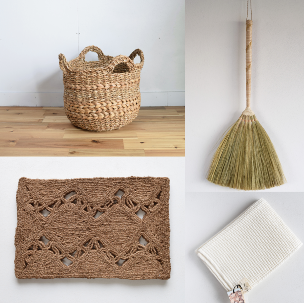 写真は左上から、洗濯かごやインテリアとしてオススメの、水辺に生えるホグラ草を使い、手作業で編み込んでつくったホグララウンドバスケット、フィリピン北部コーディリエラ地方に住む山岳民族の伝統的な手仕事で、タイガーグラスという日本のホウキよりも柔らかいい草で作られた飾っても可愛いカラバオホウキ、オーガニックコットンで柔らかい肌触りが気持ち良いオーガニックコットンワッフルフェイスタオル、ココナッツコイヤーをしっかり手編みした、外からの汚れもしっかり落としてくれる天然ココナッツ100%のマットです。