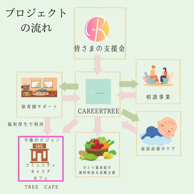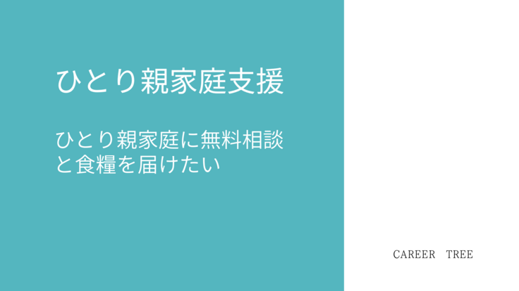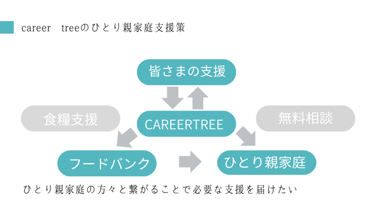 4,CAREER TREEの収益を使いひとり親家庭への無料相談支援と食糧支援を行っていくことで社会貢献をしていきます。