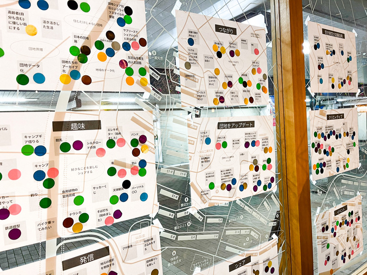 我々の期待を超えてたくさんのやってみたいが集まりました。「泊まれる団地にしたい!」「茶道サークルやってみたい!」「フードフェスやりたい!」などなど、、しかも、興味があるものにシールやコメントをお願いしたら、大変な数になりました!