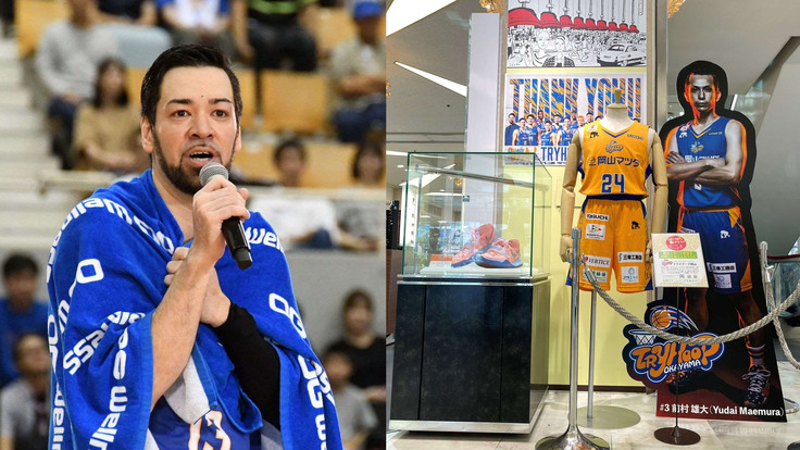 【写真㊨=B3参入初のホーム開幕戦を勝利し喜びを語る比留木選手(当時)、写真㊨=岡山高島屋でのユニホーム展示】