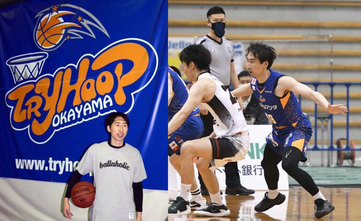 【写真㊧=岡山市内のバスケ教室会場「フリーコートTRYHOOP」、写真㊨=練習中のひとこま】