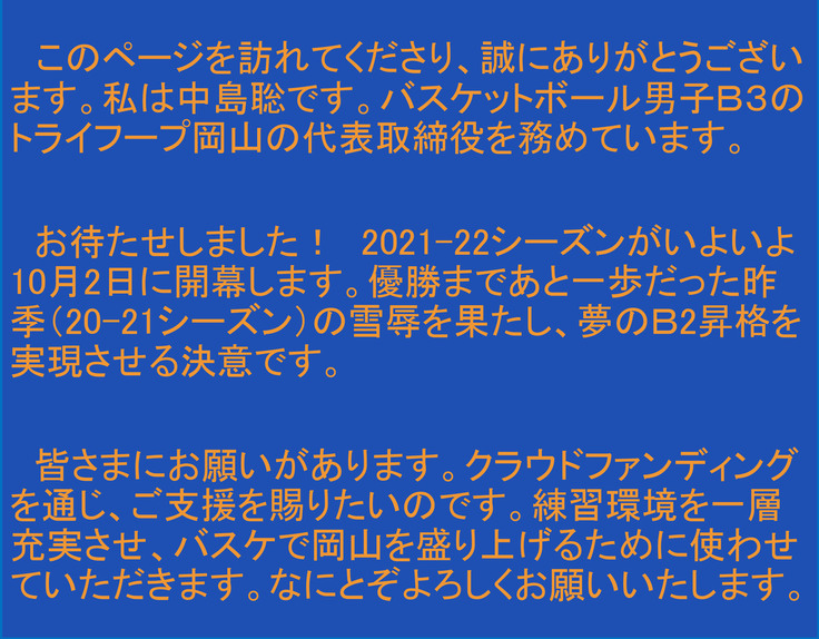 トライフープ岡山代表取締役・中島聡(なかじま・さとる) 自己紹介します。1984年9月18日生まれで、大阪府の出身です。大阪府立天王寺高校を経て、岡山大学薬学部を卒業しました。中学、高校、大学とバスケットボール部に所属し、プロ選手を目指して一時、大阪エヴェッサ(B1)に練習生として在籍しましたが、道は険しく断念しました。その後、バスケに貢献し子どもたちに夢を届けたい、との思いが募り、バスケスクールを岡山市内に設けました。これがトライフープ岡山の原点です。トライフープは二つの英単語の組み合わせです。「挑戦する」TRY(トライ)と「バスケのゴール、輪」を意味するHOOP(フープ)。私たちは、皆さまと大きな輪をつくりながら、B3優勝とB2昇格というゴールに向け挑戦します。
