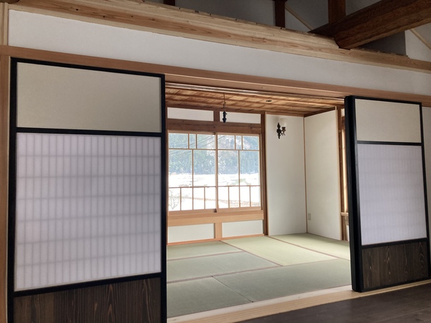 4枚続きで、右にすべて引くと、和室と洋間がひと続きになります。