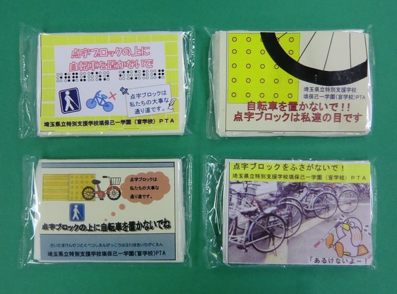 ⑤点字ブロック啓発の手作りメッセージを私たちが1枚1枚気持ちを込めて入れたポケットティッシュの4個セットで、もちろん非売品です。私たち盲学校PTAの願いが込められています。