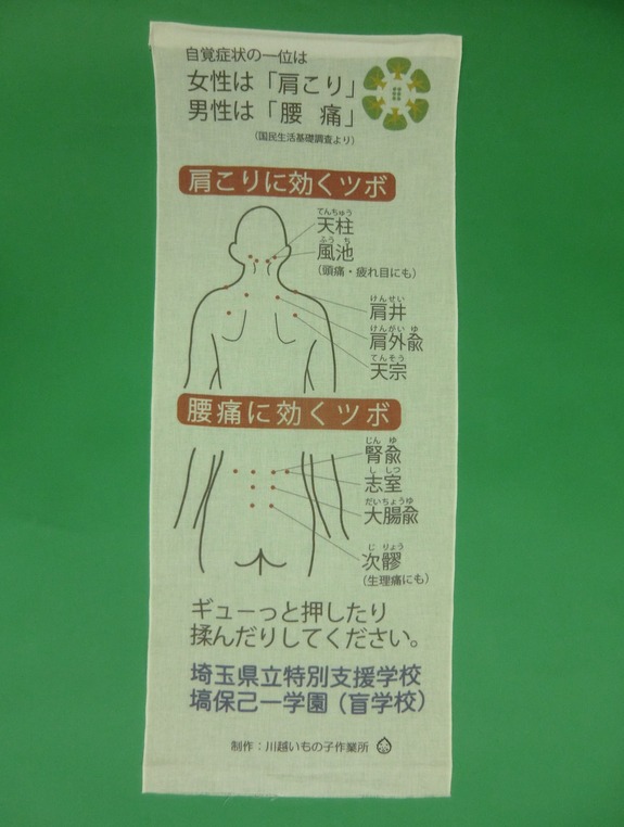 ⑨本校がデザインした肩こり・腰痛に効くツボを図示した全国でも例のない盲学校発の日本手ぬぐい(横30㎝×縦90㎝)です。この手ぬぐいは川越いもの子作業所製ですので障害者支援になっています。