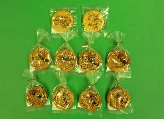 ⑫点字ブロックふさがないでの文字と絵が描かれた醤油煎餅(直径75㎜)です。本校デザインの図案が煎餅表面に描かれています。食べるのはもったいないとみなさんおっしゃいますが、食べていただくと点字ブロックふさがないでのメッセージが体の中に入っていくんです!煎餅としての味の評判も抜群です。これは第2川越いもの子作業所製ですので、障害者支援となっています。