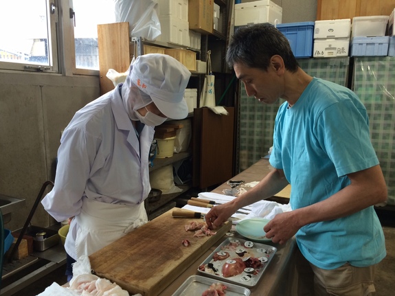 普段はライバルでもある仲卸のお二人が、この日は講師と生徒。