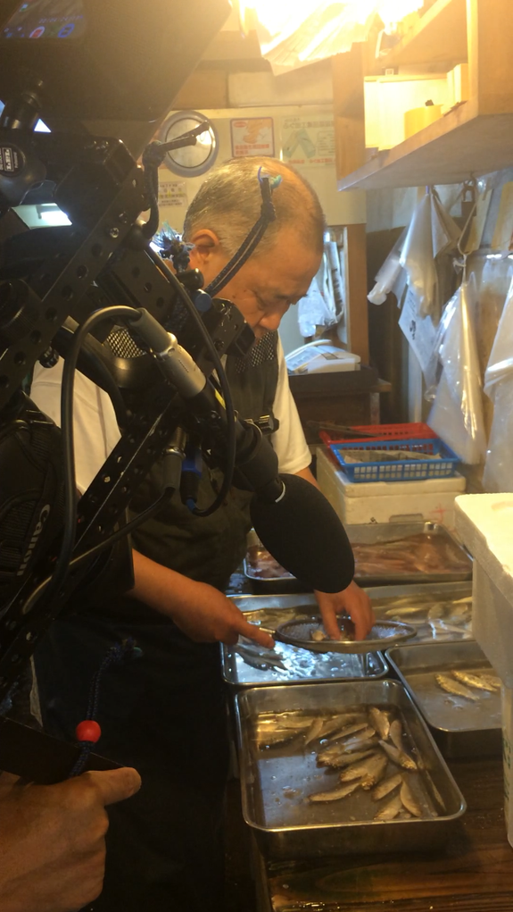 シンコは小肌の稚魚で、「シンコ、コハダ、ナカズミ、コノシロ」と名前を変えて成長していく出世魚。6月に見せていただいた時には小指よりも小さい位のサイズだったのですが、シンコの間、魚体は「一潮ごとに大きくなる」そうで、今回の撮影時は2倍以上、寿司ネタとしては二枚付けくらいのほぼコハダに近づく大きさになっていました。実はこの位の大きさになった時がシンコの香りがしっかりと味わえ一番美味しくいただけるタイミングだそう。
