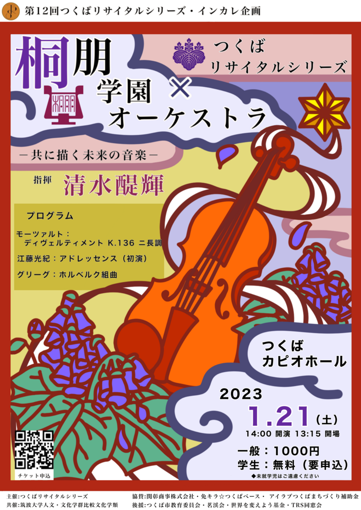 現在中心となって実行委員会を運営している3年生は、入学時からコロナ禍により学生生活に大きな制約を受けてきました。音大のみなさまも同じような学生生活を送ってこられたことと思います。だからこそ、これからの時代を担ってゆく若者どうし、励まし合い、力を合わせ、共に乗り越えていきたい。そして、つくばのみなさんを明るく元気にしたい。今回のリサイタルに込めた願いにご賛同いただいた桐朋学園の関係者の皆様のご尽力で、総勢17名の弦楽オーケストラをつくばの地にお迎えする素晴らしいプランが出来上がりました。
